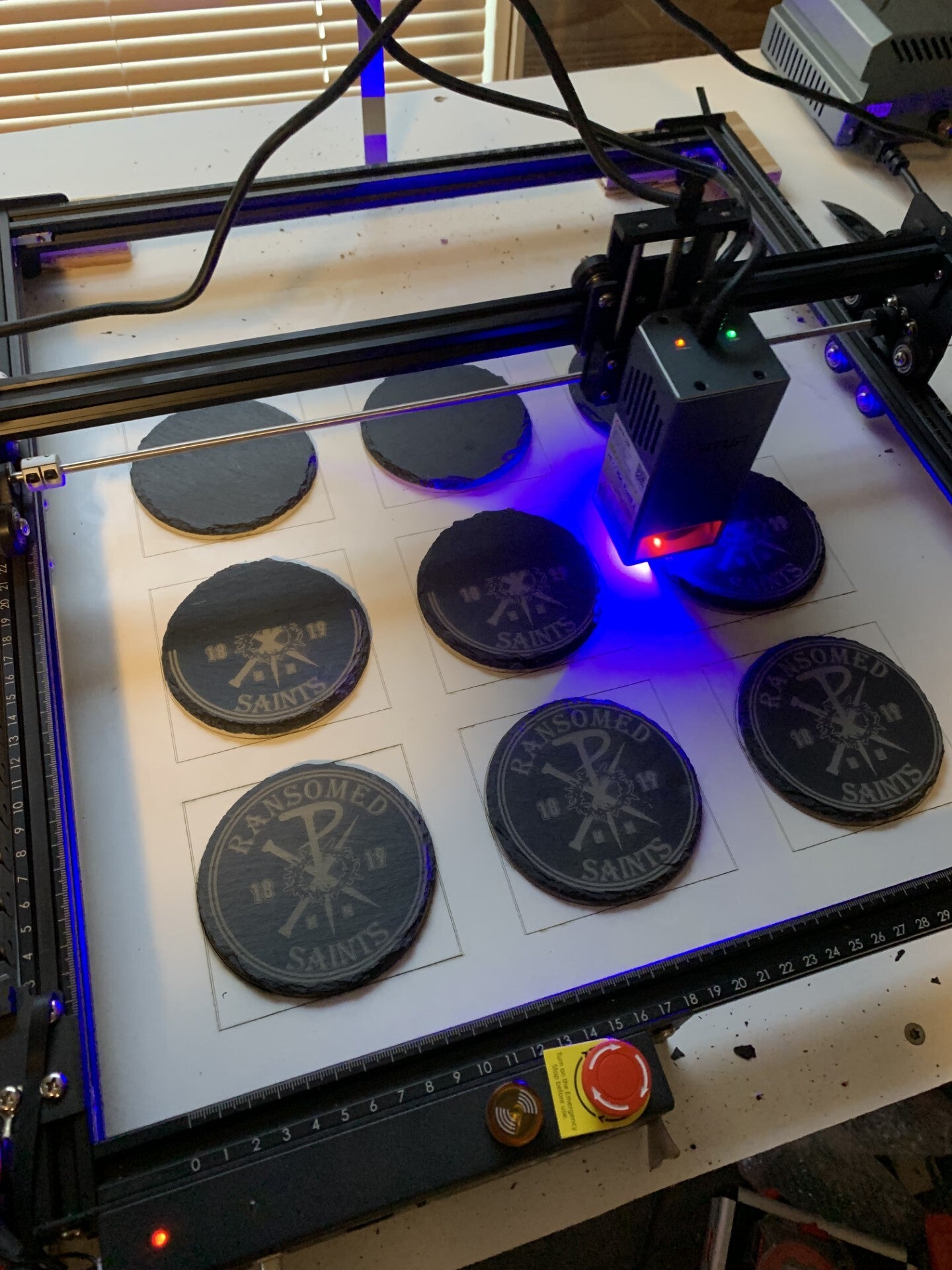 These coasters are finished physical products featuring the images shown on this page, precision laser engraved onto natural slate. The engraving creates a striking contrast against the dark stone, highlighting the design with crisp detail. Durable and functional, these coasters protect surfaces while adding a unique decorative touch to any home, office, or gathering space.